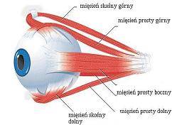 Mięśnie oka. Gałkę oczną porusza sześć mięśni zewnętrznych oka. Cztery mięśnie proste: górny, dolny, wewnętrzny i zewnętrzny, których tylne przyczepy znajdują się daleko za gałką oczną. Odmienny i bardziej złożony jest przebieg mięśni skośnych, które warunkują odpowiednie ruchy oczu oraz skracanie i wydłużanie gałki ocznej.